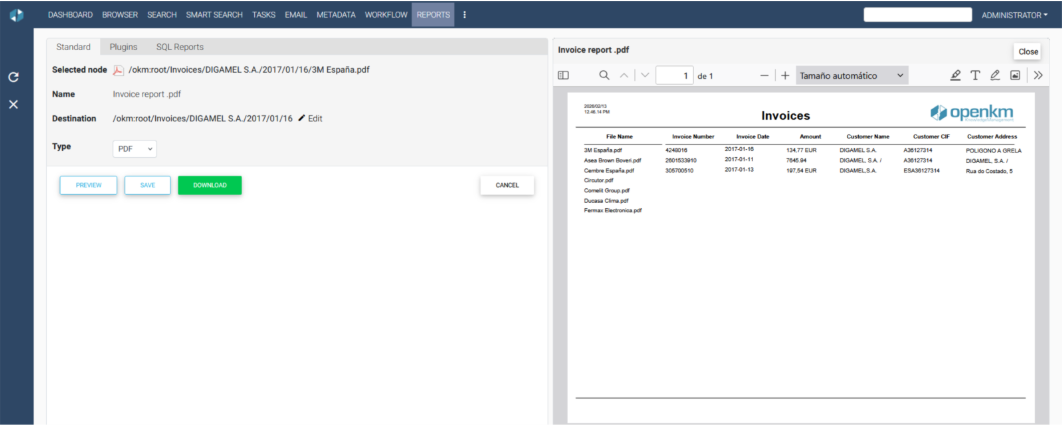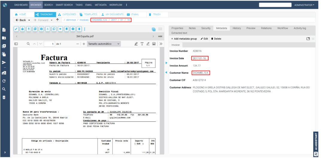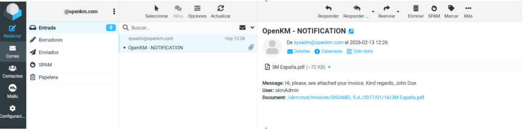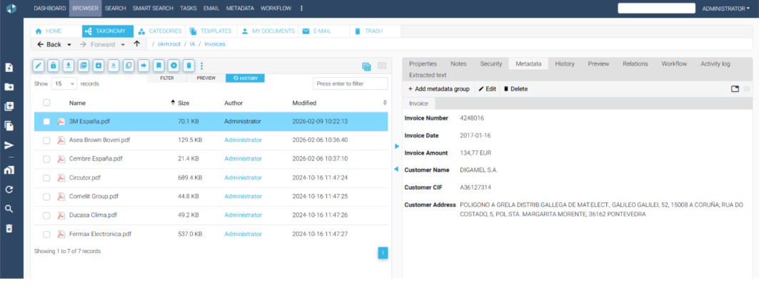 OpenKM identifica el tipo de documento (por ejemplo, factura de cliente, factura de proveedor, albarán). Esto es clave porque cada tipo sigue reglas distintas.
