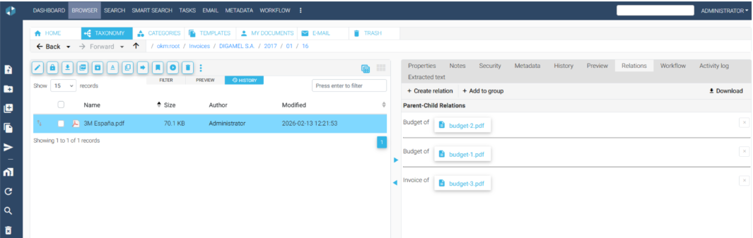Con OpenKM, los albaranes se relacionan con la factura correspondiente. Así se puede:
